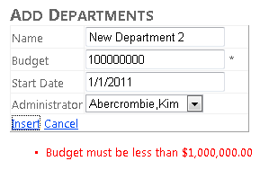 Wenn Sie einen ungültigen Budgetbetrag eingeben und dann auf "Aktualisieren" klicken, wird das gleiche Sternchen und dieselbe Fehlermeldung angezeigt, die Sie auf der Seite Departments.aspx angezeigt haben.