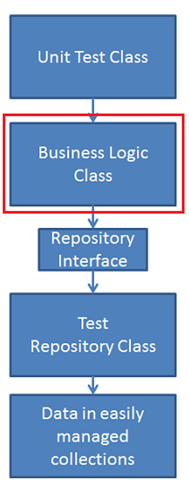 Die CRUD-Methoden, die die Repositoryklasse aufrufen, und die beiden Konstruktoren ermöglichen es, die Geschäftslogikklasse mit dem von Ihnen ausgewählten Back-End-Datenspeicher zu verwenden. Die Geschäftslogikklasse muss nicht wissen, wie die klasse, die sie aufruft, die Daten speichert. (Dies wird häufig als Persistenz-Ignoranz bezeichnet.) Dies erleichtert Komponententests, da Sie die Geschäftslogikklasse mit einer Repositoryimplementierung verbinden können, die so einfach wie In-Memory-Sammlungen List zum Speichern von Daten verwendet.