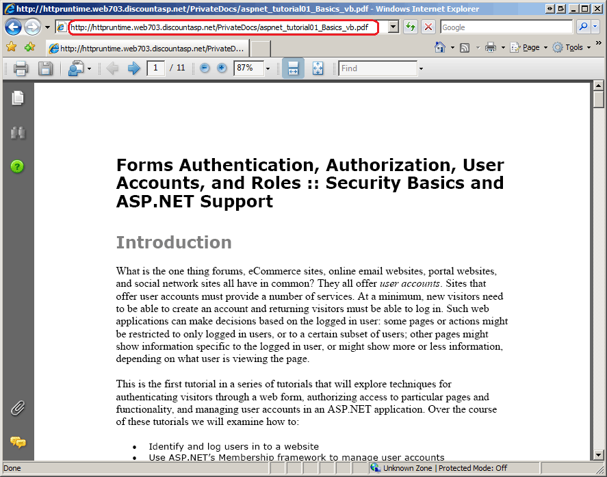 Besuchen Sie mit dem ASP.NET Development Server die Website, und geben Sie die direkte URL zu einer der PDF-Dateien in der Adressleiste Ihres Browsers ein. Wenn Sie die website heruntergeladen haben, die diesem Lernprogramm zugeordnet ist, sollte die URL ungefähr wie folgt aussehen: http://localhost:portNumber/PrivateDocs/aspnet_tutorial01_Basics_vb.pdf