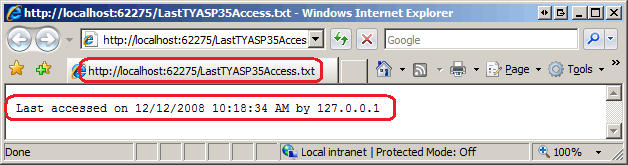 Besuchen Sie als nächstes die Buchbesprechungsseite von Teach Yourself ASP.NET 3.5 in 24 Hours in der Entwicklungsumgebung mit dem ASP.NET Development Server. Angenommen, Sie sind mit einem Konto angemeldet, das über ausreichende Berechtigungen zum Erstellen und Ändern einer Textdatei im Stammverzeichnis der Webanwendung verfügt, wird die Buchüberprüfung wie zuvor angezeigt, aber jedes Mal, wenn die Seite besucht wird, das Datum und die Uhrzeit und die IP-Adresse des Benutzers in der LastTYASP35Access.txt Datei gespeichert. Verweisen Sie Ihren Browser auf diese Datei; Es sollte eine Meldung wie in Abbildung 1 angezeigt werden.