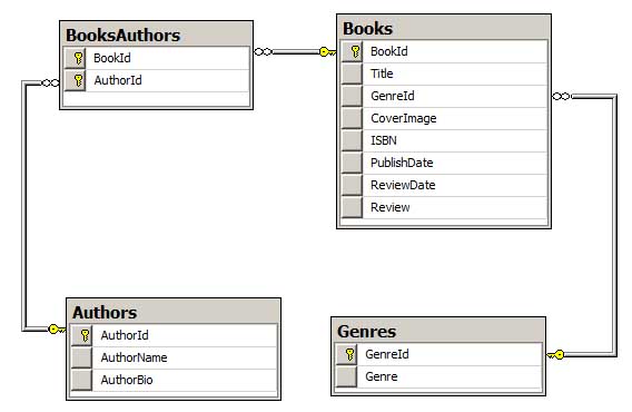 BooksAuthors- eine n:n-Verknüpfungstabelle, die angibt, welche Autoren welche Bücher geschrieben haben.