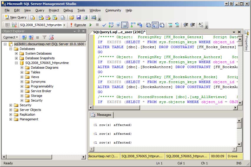 Da wir nun über das Skript verfügen, das die SQL-Befehle enthält, um die Datenbank und die zugehörigen Daten zu erstellen, besteht alles darin, das Skript in der Produktionsdatenbank auszuführen. Einige Webhostanbieter bieten ein Textfeld in der Systemsteuerung an, in dem Sie SQL-Befehle eingeben können, die in Ihrer Datenbank ausgeführt werden sollen. Wenn Sie über eine sehr große Skriptdatei verfügen, funktioniert diese Option möglicherweise nicht (die REVIEWS.MDF.sql Skriptdatei ist beispielsweise größer als 425 KB).