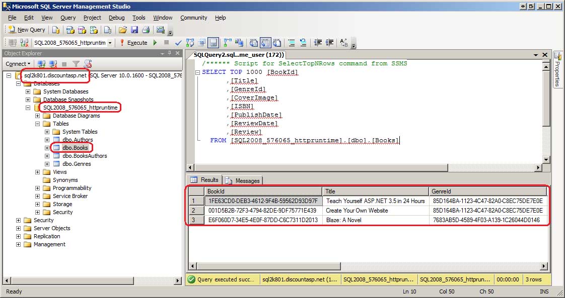 Wie weiter oben in diesem Lernprogramm erwähnt, ist die Datenbank der Book Reviews-Website eine SQL Server 2008 Express Edition-Datenbank, die App_Data im Ordner gespeichert ist. Die Bereitstellung einer solchen Datenbank wäre so einfach wie das Kopieren des App_Data Ordners aus der Entwicklungsumgebung in die Produktionsumgebung. Die meisten Webhostanbieter unterstützen jedoch das Hosten von Datenbanken im App_Data Ordner aufgrund von Sicherheitsgründen nicht. Stattdessen stellen Webhosts ein Konto auf einem SQL Server-Datenbankserver in ihrer Umgebung bereit. Die Bereitstellung der Datenbank aus Ihrer Entwicklungsumgebung in der Produktionsumgebung erfordert, dass Ihre Datenbank auf dem Webserver des Webhosts registriert wird.