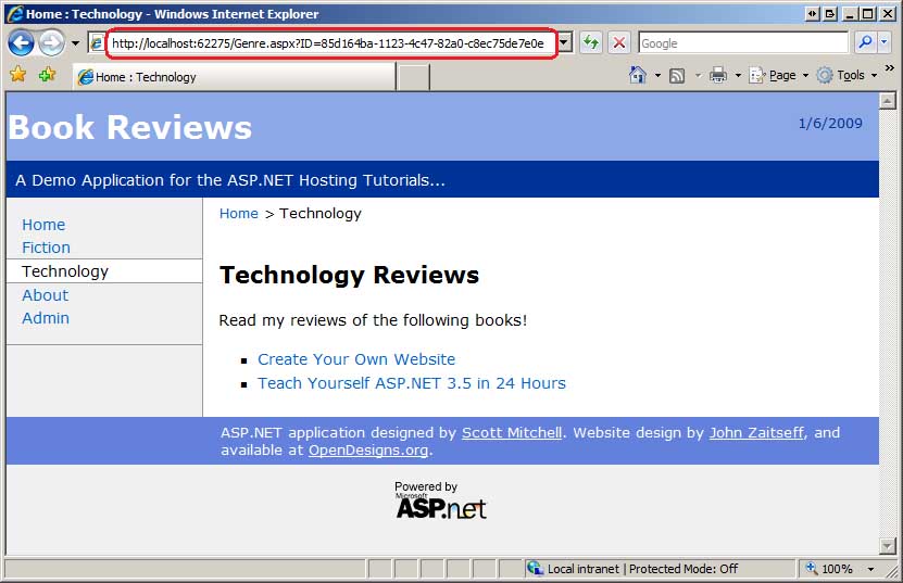 Die vorherige Version der Website "Buchrezensionen" verfügte über eine separate ASP.NET Seite für jedes Buch. Beispielsweise gab es eine Seite mit dem Namen ~/Tech/TYASP35.aspx , die die Rezension für "Lernen Sie selbst ASP.NET 3,5 in 24 Stunden" enthielt. Diese neue datengesteuerte Version der Website enthält die Rezensionen in der Datenbank und eine einzelne ASP.NET Seite, Review.aspx?ID=bookId, die die Rezension für das angegebene Buch anzeigt. Ebenso gibt es eine Genre.aspx?ID=genreId-Seite , die die überprüften Bücher im angegebenen Genre auflistet.