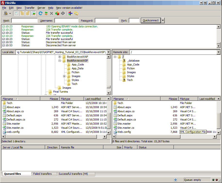 Abbildung 1 zeigt FileZilla, nachdem die erforderlichen Dateien kopiert wurden. FileZilla zeigt die Dateien auf dem lokalen Computer auf der linken Seite und die Dateien auf dem Remotecomputer auf der rechten Seite an. Wie in Abbildung 1 dargestellt, befinden sich die ASP.NET-Quellcodedateien, z. B. About.aspx.cs, auf dem lokalen Computer (der Entwicklungsumgebung), wurden aber nicht an den Webhost (die Produktionsumgebung) kopiert, da Codedateien nicht bereitgestellt werden müssen, wenn die explizite Kompilierung verwendet wird.