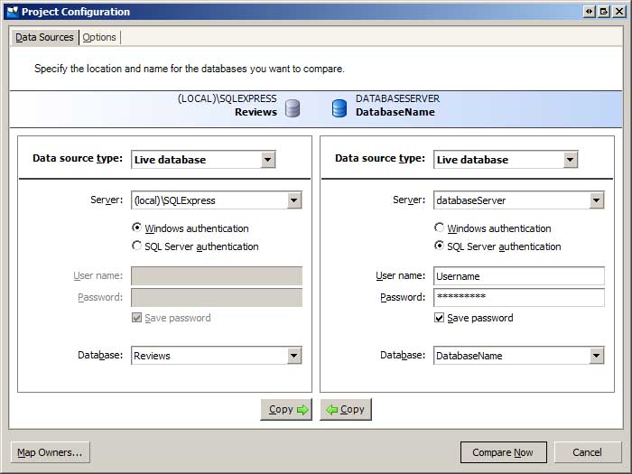 Wenn sql Compare startet, wird das Dialogfeld "Vergleichsprojekte" geöffnet, in dem die gespeicherten SQL-Vergleichsprojekte angezeigt werden. Erstellen Sie ein neues Projekt. Dadurch wird der Projektkonfigurations-Assistent gestartet, der Informationen zu den zu vergleichenden Datenbanken auffordert (siehe Abbildung 1). Geben Sie die Informationen für die Entwicklungs- und Produktionsumgebungsdatenbanken ein.