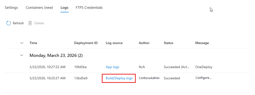 Suchen Sie in der AZD-Ausgabe den Link zum Streamen von App Service-Protokollen, und navigieren Sie im Browser dorthin. In der AZD-Ausgabe sieht der Link wie folgt aus: