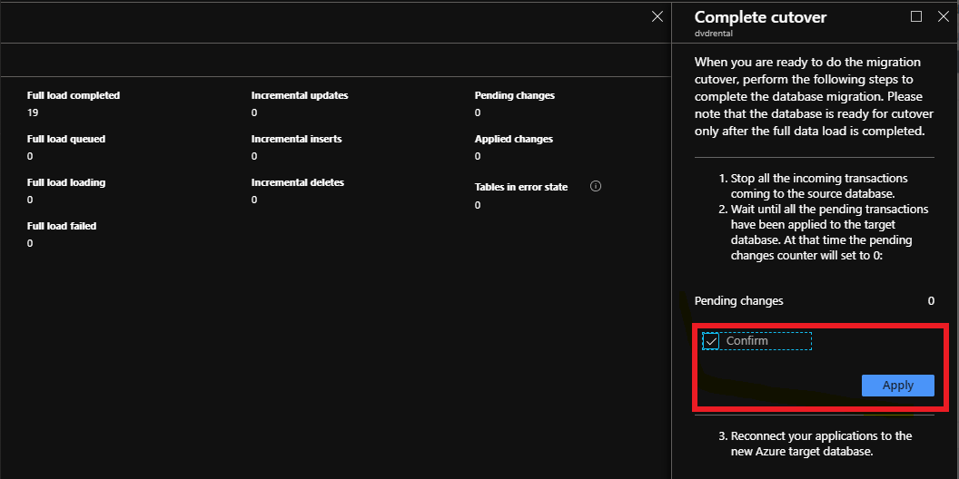 0anzeigt, um sicherzustellen, dass alle eingehenden Transaktionen für die Datenbank angehalten werden, aktivieren Sie das Kontrollkästchen Bestätigen, und klicken Sie auf Anwenden.Wenn als Status der Datenmigration Abgeschlossen angezeigt wird, stellen Sie eine Verbindung zwischen Ihren Anwendungen und der neuen Azure Database for PostgreSQL-Zieldatenbank her.