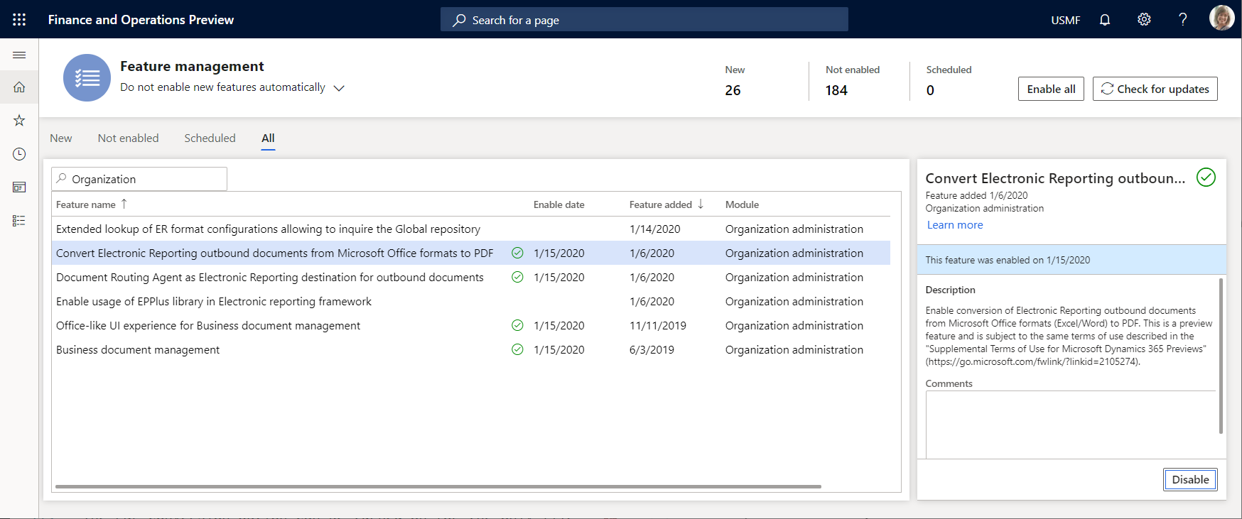 Um die PDF-Konvertierungsoption in der aktuellen Finance-Instanz verfügbar zu machen, öffnen Sie den Arbeitsbereich Funktionsverwaltung, und aktivieren Sie die Funktion Ausgehende Dokumente für die elektronische Berichterstellung von Microsoft Office Formaten in PDF konvertieren.