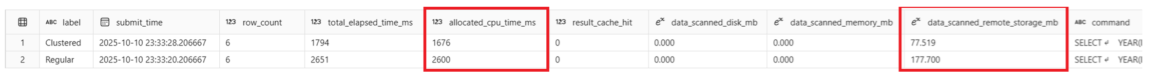 Beide Abfragen haben eine Zeilenanzahl von 6 und ähnliche Ausführungszeiten. Die Clustered Abfrage zeigt total_elapsed_time_ms von 1 794, allocated_cpu_time_ms von 1 676 und data_scanned_remote_storage_mb von 77.519. Die Regular Abfrage zeigt total_elapsed_time_ms 2651, allocated_cpu_time_ms von 2600 und data_scanned_remote_storage_mb von 177.700. Diese Zahlen zeigen, dass obwohl beide Abfragen dieselben Ergebnisse zurückgegeben haben, die Clustered Version ungefähr 36% weniger CPU-Zeit als die Regular Version verwendet und ungefähr 56% weniger Daten auf dem Datenträger gescannt hat. In beiden Abfrageausführungen wurde kein Cache verwendet. Dies sind wichtige Ergebnisse, um die Abfrageausführungszeit und den Verbrauch zu reduzieren und die lpepPickupDatetime Spalte zu einem starken Kandidaten für das Daten-Clustering zu machen.