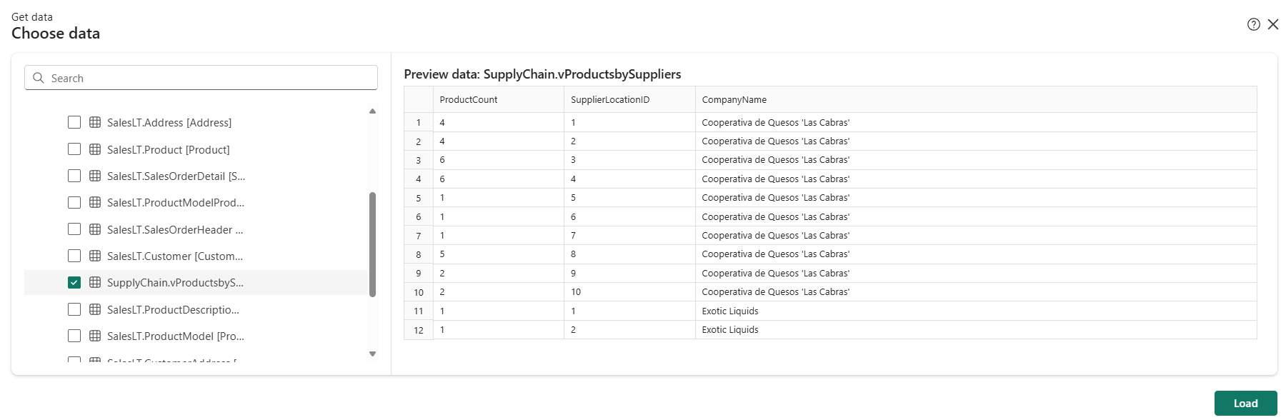 SupplyChain.vProductsBySuppliersfinden, die Ansicht, die Sie zuvor in diesem Tutorial erstellt haben. Wählen Sie es aus.Wählen Sie die Schaltfläche Laden aus.