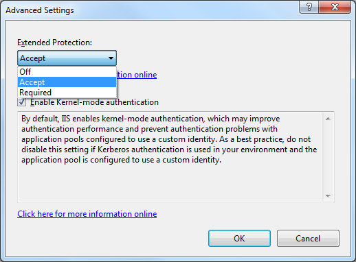 appcmd.exe set config "Default Web Site" -section:system.webServer/security/authentication/windowsAuthentication /extendedProtection.tokenChecking:"Allow" /extendedProtection.flags:"None" /commit:apphost