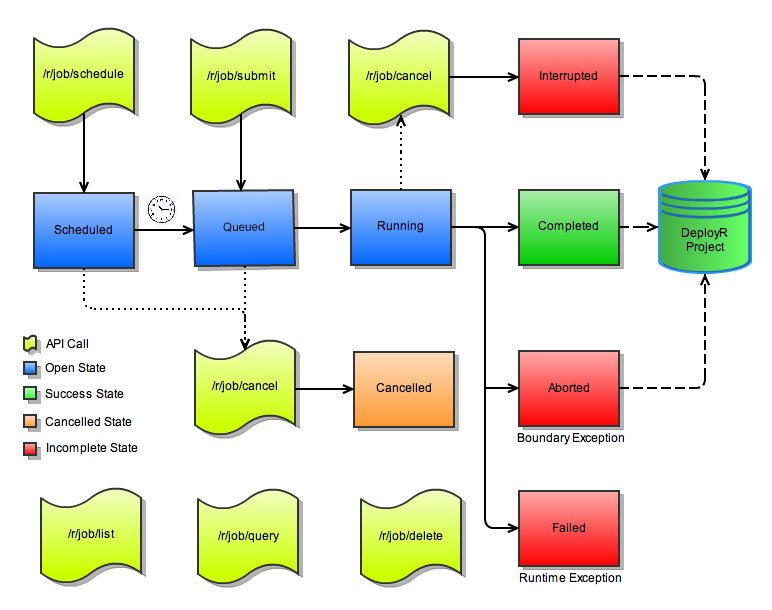 The DeployR environment supports this same set of functionalities by introducing the concept of projects on the API. As with working in an R console window, all operations on project APIs are synchronous, where requests are processed serially and blocked until completion. The project management APIs facilitate basic lifecycle management for projects.