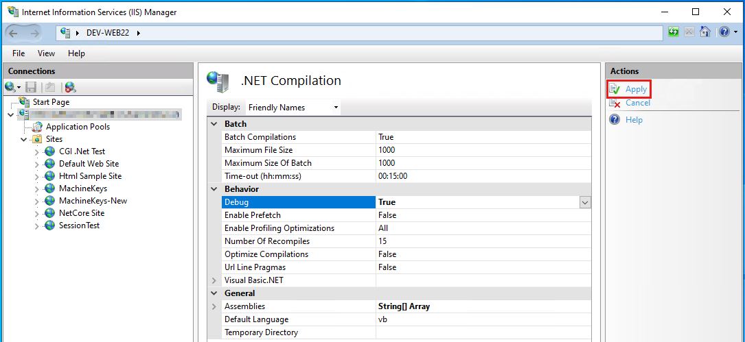 Legen Sie in der Liste der Parameterwerte, die im mittleren Bereich des IIS-Managers angezeigt werden, den Wert von Debug unter der Kategorie "Verhalten " auf Folgendes fest: