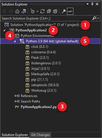 5. Suchen Sie unter Ihrem Projektknoten den Python-Umgebungen-Knoten(4). Erweitern Sie den Knoten, um die verfügbaren Python-Dolmetscher anzuzeigen.