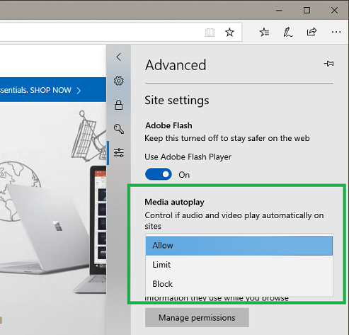 Microsoft Edge provides customers with the ability to personalize their browsing preferences on websites that autoplay media with sound in order to minimize distractions on the web and conserve bandwidth. Additionally, Microsoft Edge automatically suppresses autoplay of media in background tabs.
