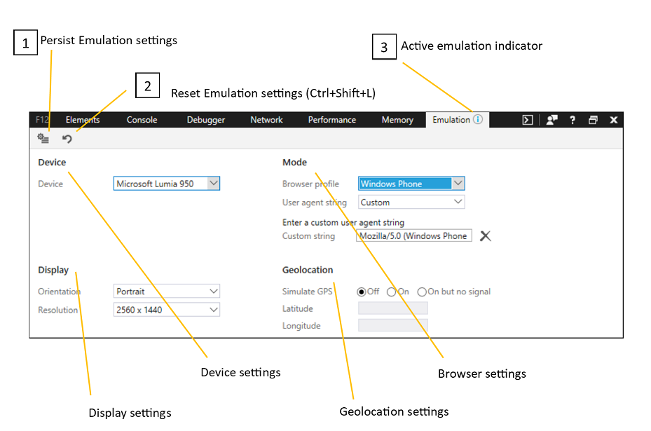 2. The Reset Emulation settings button resets your emulation settings back to the default Desktop browser profile and Microsoft Edge user agent string with GPS turned off.