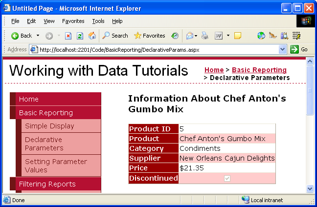 For this tutorial let's start by illustrating how to use a parameter set to a hard-coded value. Specifically, we'll look at adding a DetailsView to the page that displays information about a specific product, namely Chef Anton's Gumbo Mix, which has a ProductID of 5. Next, we'll see how to set the parameter value based on a Web control. In particular, we'll use a TextBox to let the user type in a country/region, after which they can click a Button to see the list of suppliers that reside in that country/region.