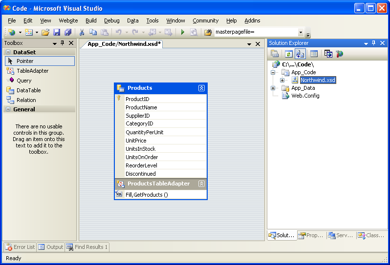 At this point we have a Typed DataSet with a single DataTable (Northwind.Products) and a strongly-typed DataAdapter class (NorthwindTableAdapters.ProductsTableAdapter) with a GetProducts() method. These objects can be used to access a list of all products from code like: