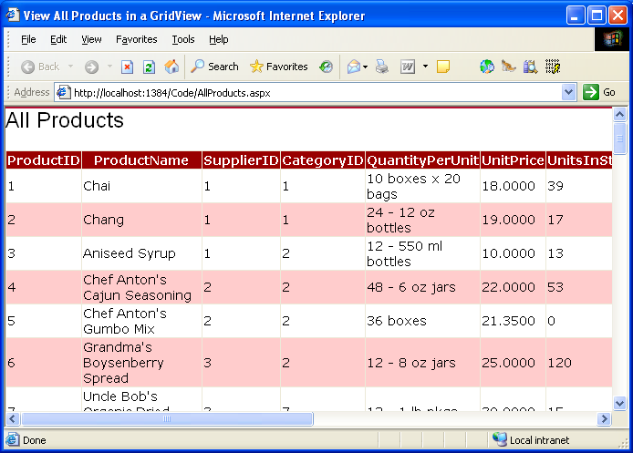 Each object used in this example is also strongly-typed, allowing Visual Studio to provide IntelliSense and compile-time type checking. And best of all the DataTables returned by the TableAdapter can be bound to ASP.NET data Web controls, such as the GridView, DetailsView, DropDownList, CheckBoxList, and several others. The following example illustrates binding the DataTable returned by the GetProducts() method to a GridView in just a scant three lines of code within the Page_Load event handler.