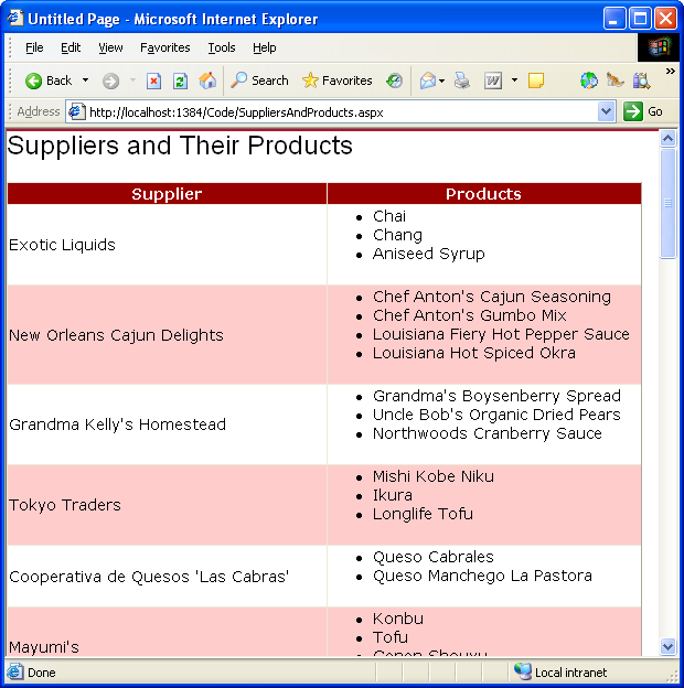 • A TemplateField that contains a BulletedList control that is bound to the results returned by the GetProducts() method for each supplier.