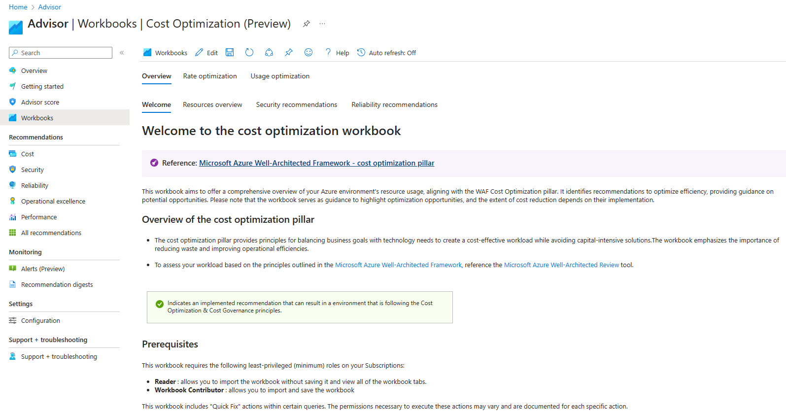 The Azure Cost Optimization workbook is designed to provide an overview and help you optimize costs of your Azure environment. It offers a set of cost-relevant insights and recommendations aligned with the Well-Architected Framework Cost Optimization pillar.