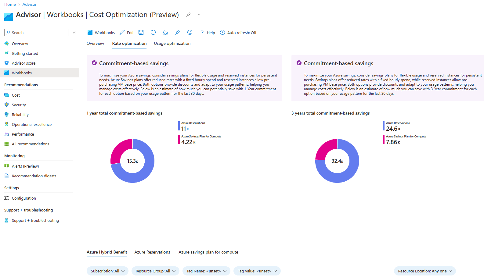 The Azure Cost Optimization workbook serves as a centralized hub for some of the most commonly used tools that can help you drive utilization and efficiency goals. It offers a range of recommendations, including Azure Advisor cost recommendations, identification of idle resources, and management of improperly deallocated Virtual Machines. Additionally, it provides recommendations for applying Azure Reservations and Savings Plan for Compute and insights into using Azure Hybrid Benefit options. The workbook template is available in Azure Advisor gallery.