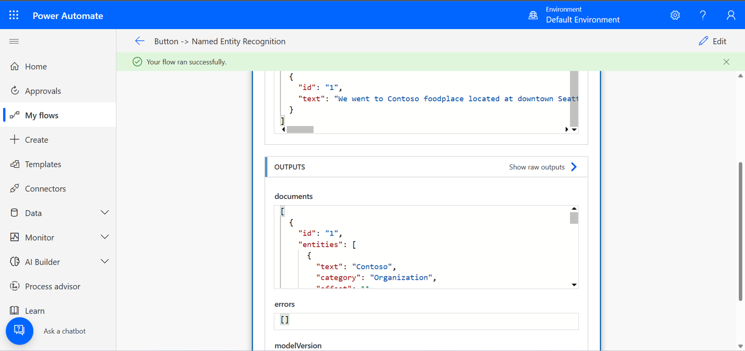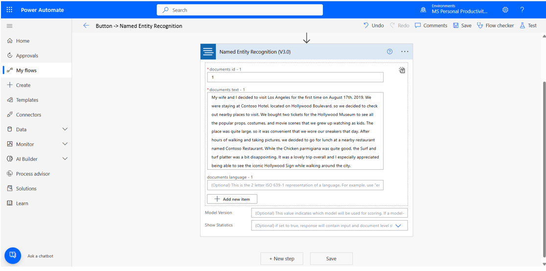 In this tutorial, you'll create a Power Automate flow to extract entities found in text, using Named entity recognition.