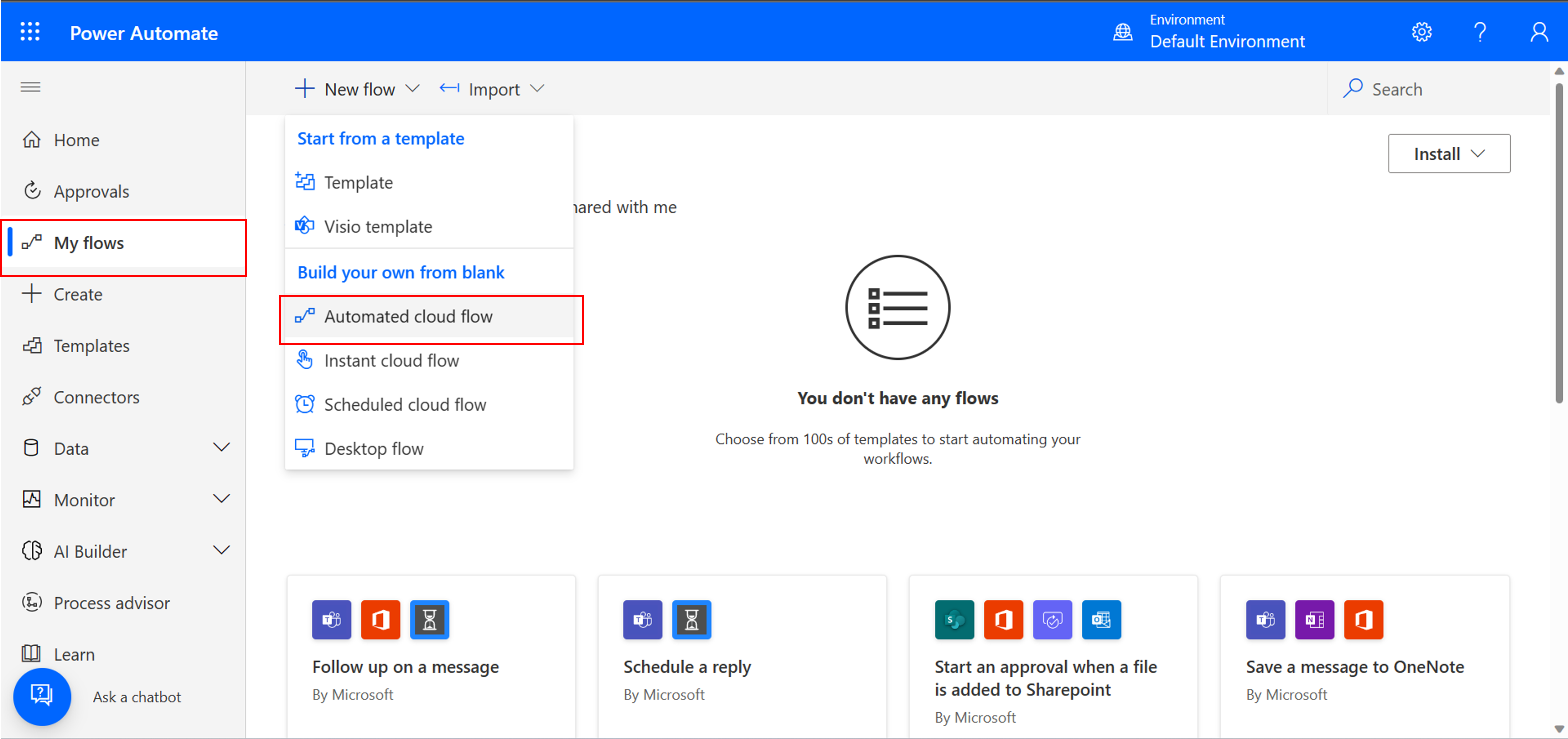 From the left side menu, select My flows. Then select New flow > Automated cloud flow.