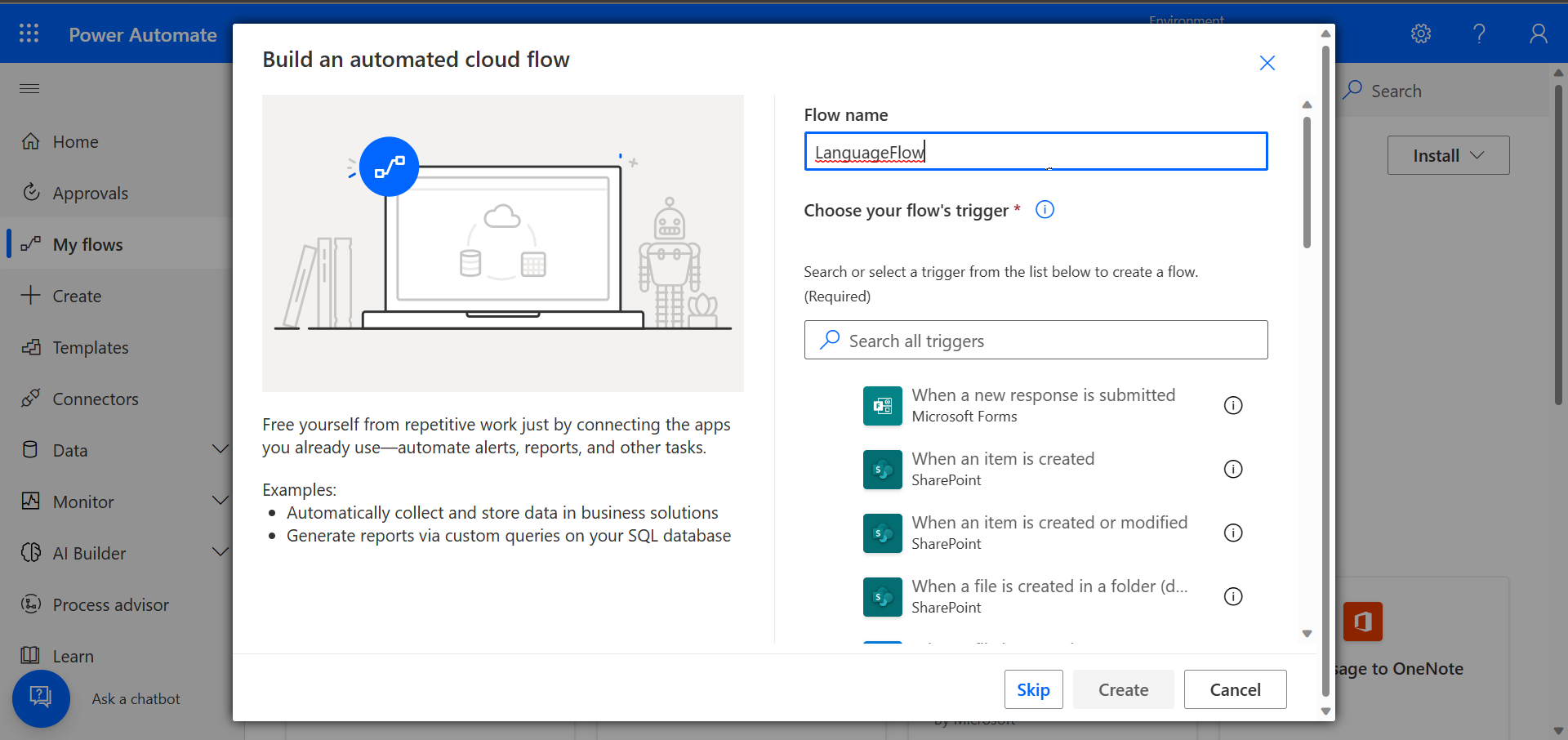 LanguageFlow. Then select Skip to continue without choosing a trigger.Under Triggers select Manually trigger a flow.