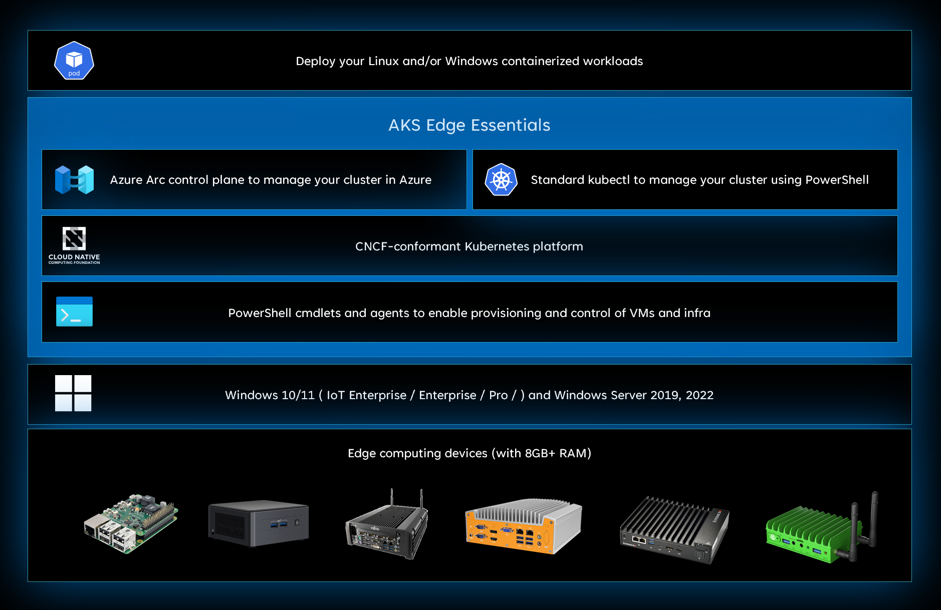 • A lightweight, CNCF-conformant K8S and K3S distribution that is supported and managed by Microsoft. The key difference between AKS on Azure Local and AKS on Windows Server is that AKS on Windows Server has minimal compute and memory requirements (4 GB RAM and 2 vCPUs).