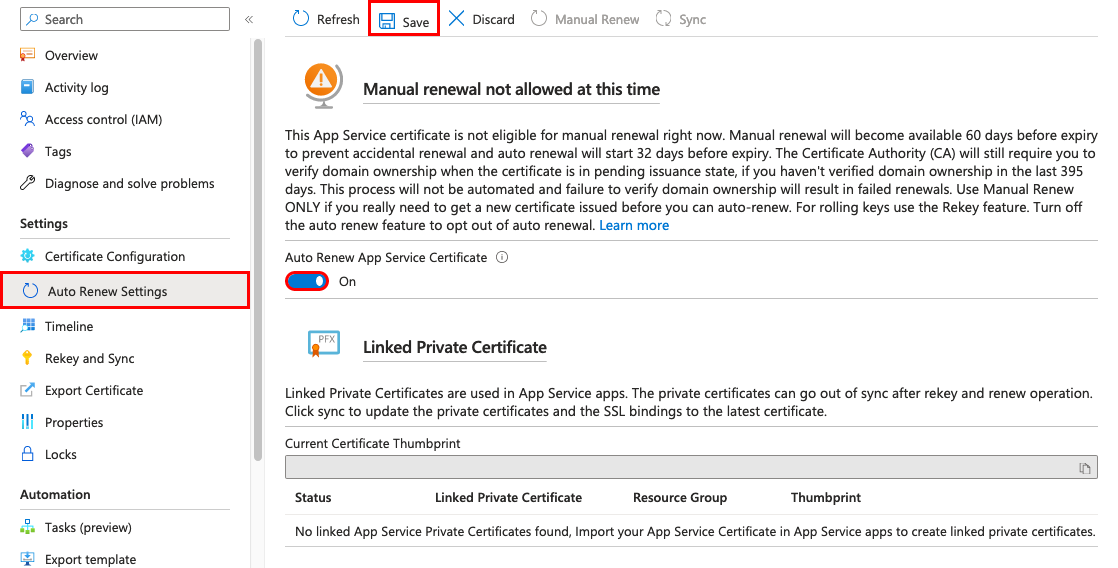 Enable auto renewal Select whether to automatically renew the certificate before expiration. Each renewal extends the certificate expiration by one year. The cost is charged to your subscription.