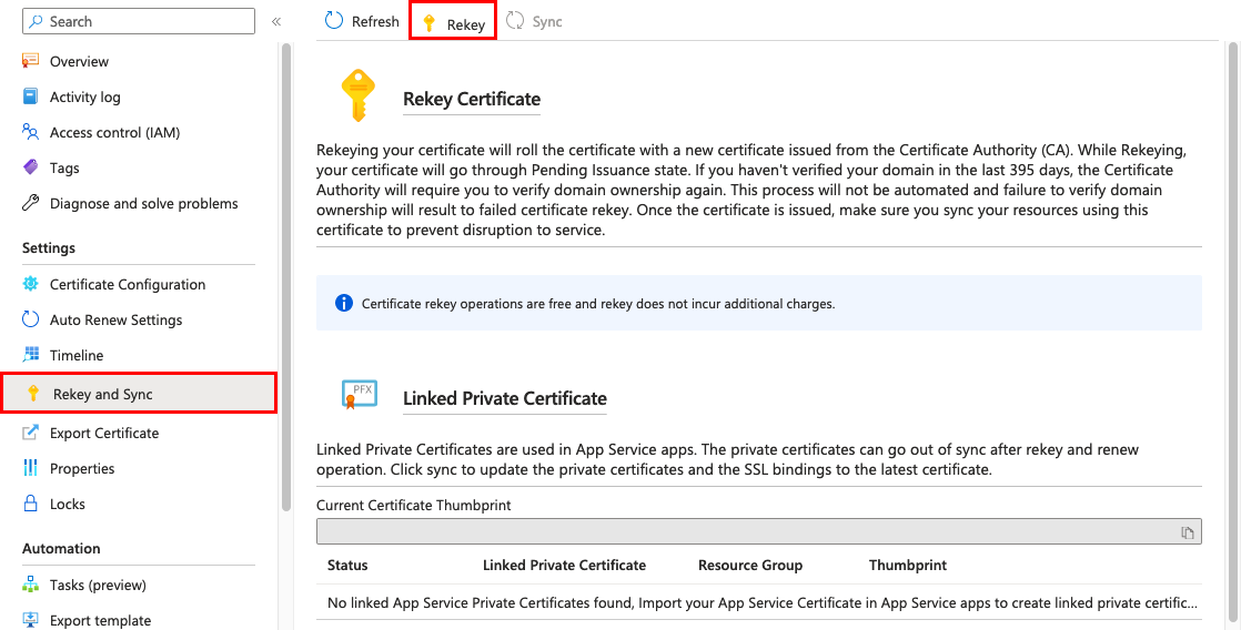 1. On the App Service Certificates page, select the certificate. On the left pane, select Rekey and Sync.