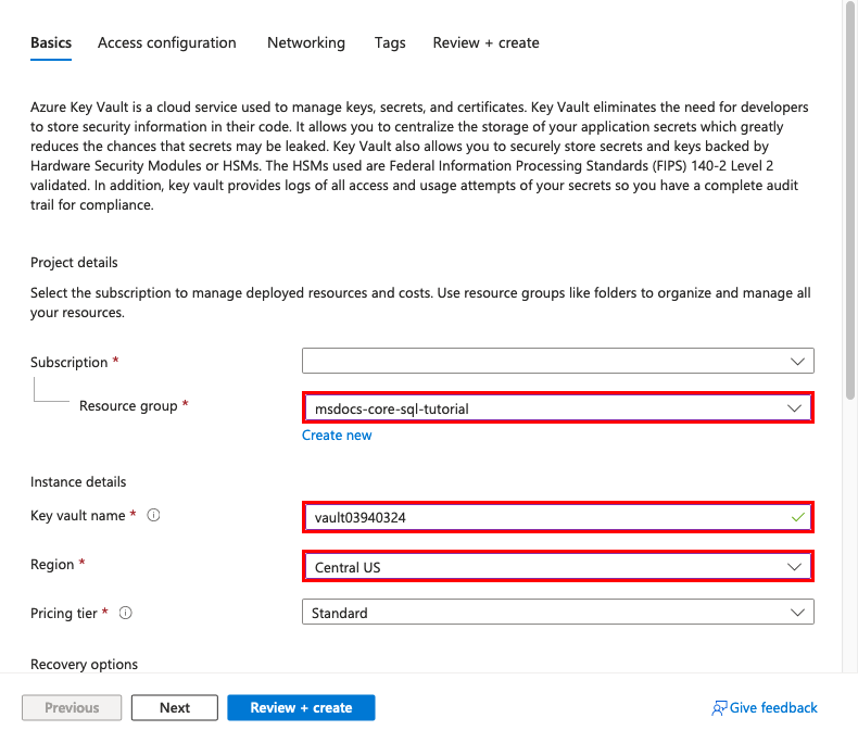 1. Name: msdocs-core-sql-XYZ. A resource group named msdocs-core-sql-XYZ_group will be generated for you.