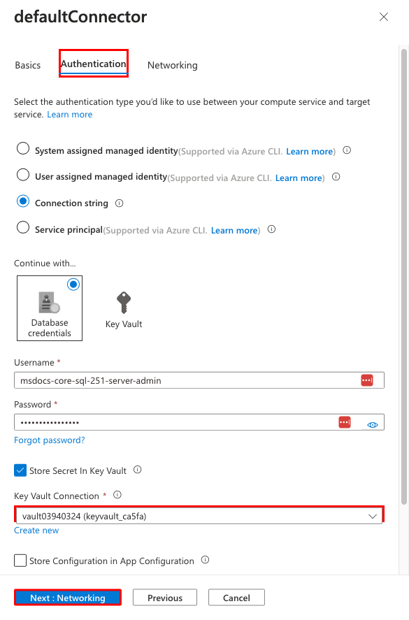 The creation wizard generated the connectivity variable for you already as .NET connection strings and app settings. However, the security best practice is to keep secrets out of App Service completely. You'll move your secrets to a key vault and change your app setting to Key Vault references with the help of Service Connectors.