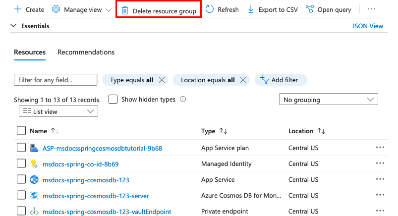 2. In Resource Group, select msdocs-spring-cosmosdb-tutorial.
