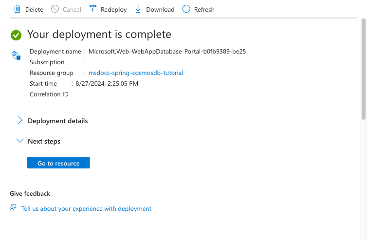 4. In Resource Group, select msdocs-spring-cosmosdb-tutorial.