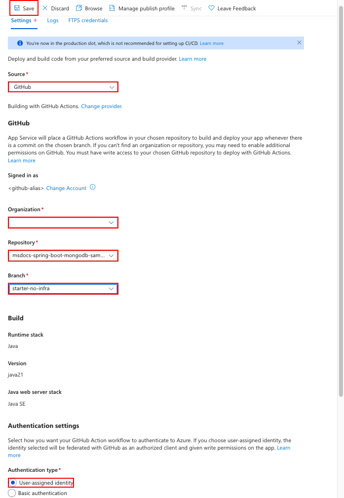 • Deploy a Spring Boot sample app to App Service from a GitHub repository.