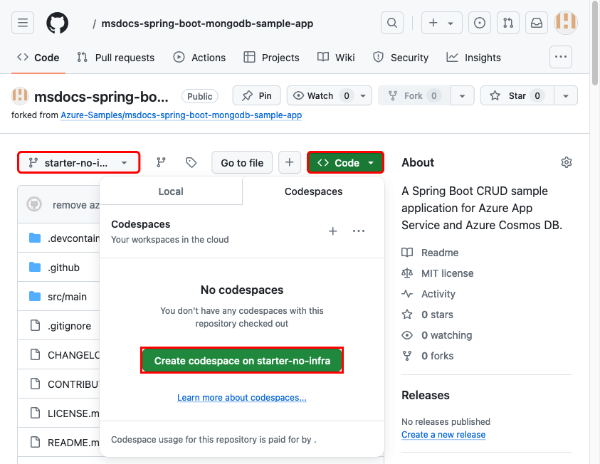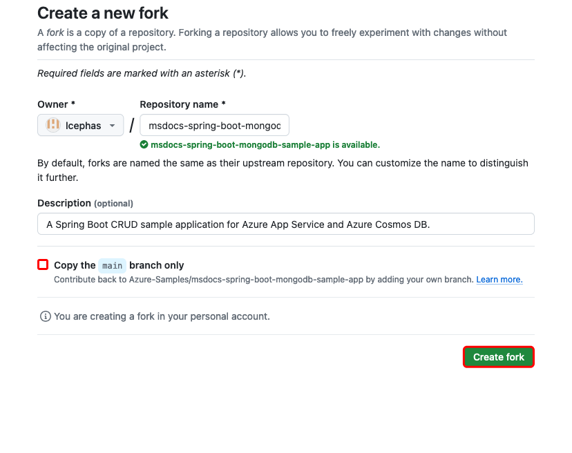 2. Navigate to https://github.com/Azure-Samples/msdocs-spring-boot-mongodb-sample-app/fork.