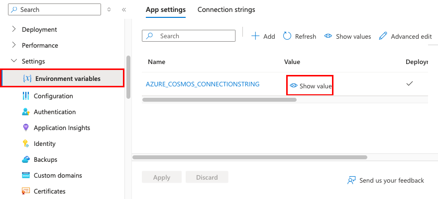 2. Next to AZURE_COSMOS_CONNECTIONSTRING, select Show value. This connection string lets you connect to the Cosmos DB database secured behind a private endpoint. However, the secret is saved directly in the App Service app, which isn't the best. You'll change this.