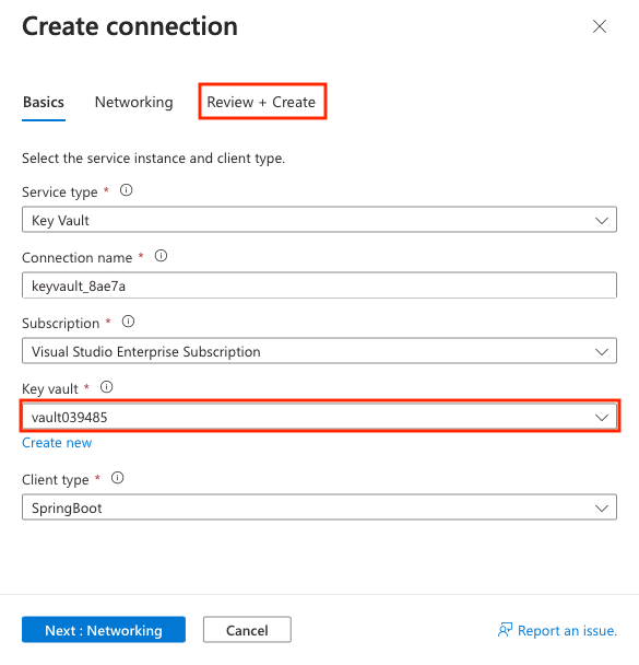 13. Select Review + create, then select Create. Wait for the key vault deployment to finish. You should see "Your deployment is complete."