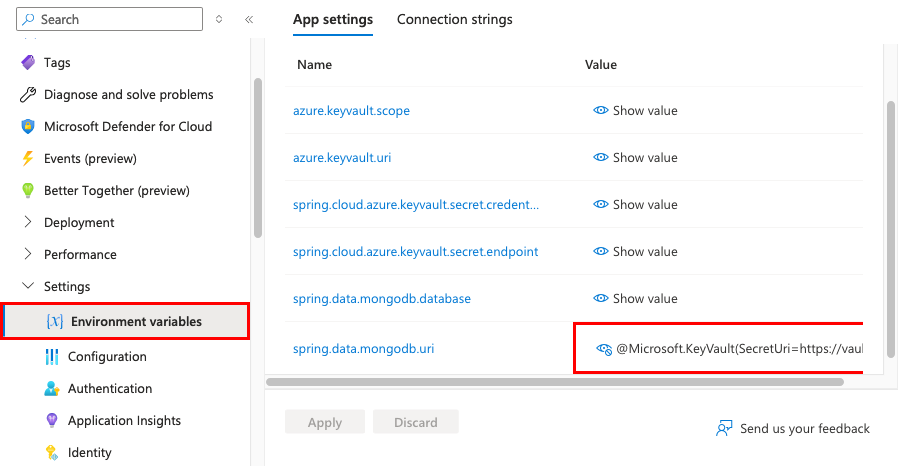 If you look at the value of spring.data.mongodb.uri, it should be @Microsoft.KeyVault(...), which means that it's a key vault reference because the secret is managed in the key vault.