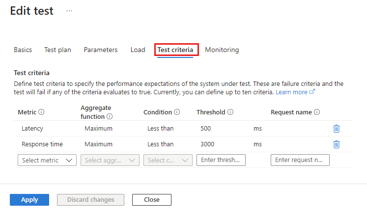 When you run load tests as part of your CI/CD pipeline, you can use test fail criteria to identify performance regressions with an application build.