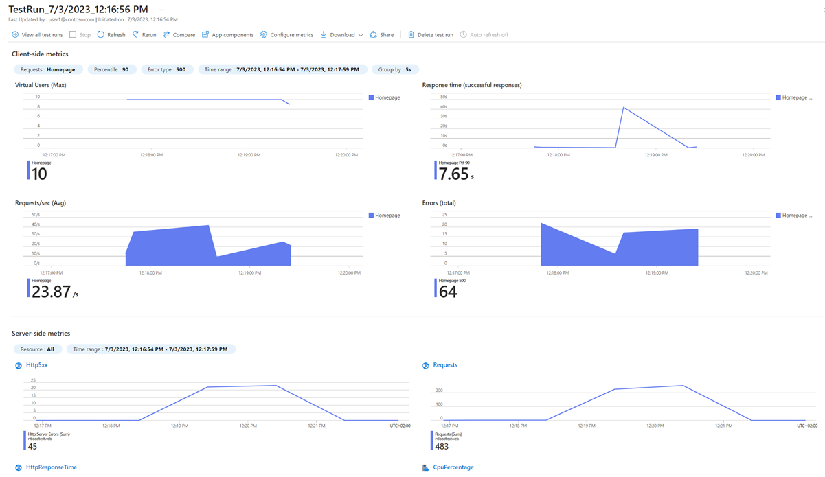 • Client-side metrics: test engine metrics, such as the end-to-end response time, number of requests per second, or the error percentage. These metrics give an overall indication whether the application can support the simulated user load.