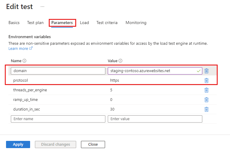 Another use for parameters is when you want to reuse your test script across multiple Azure App Service deployment slots. Deployment slots are live apps with their own host names and separate URLs. Use a parameter for the application endpoint and then you can set up staging environments for your application.