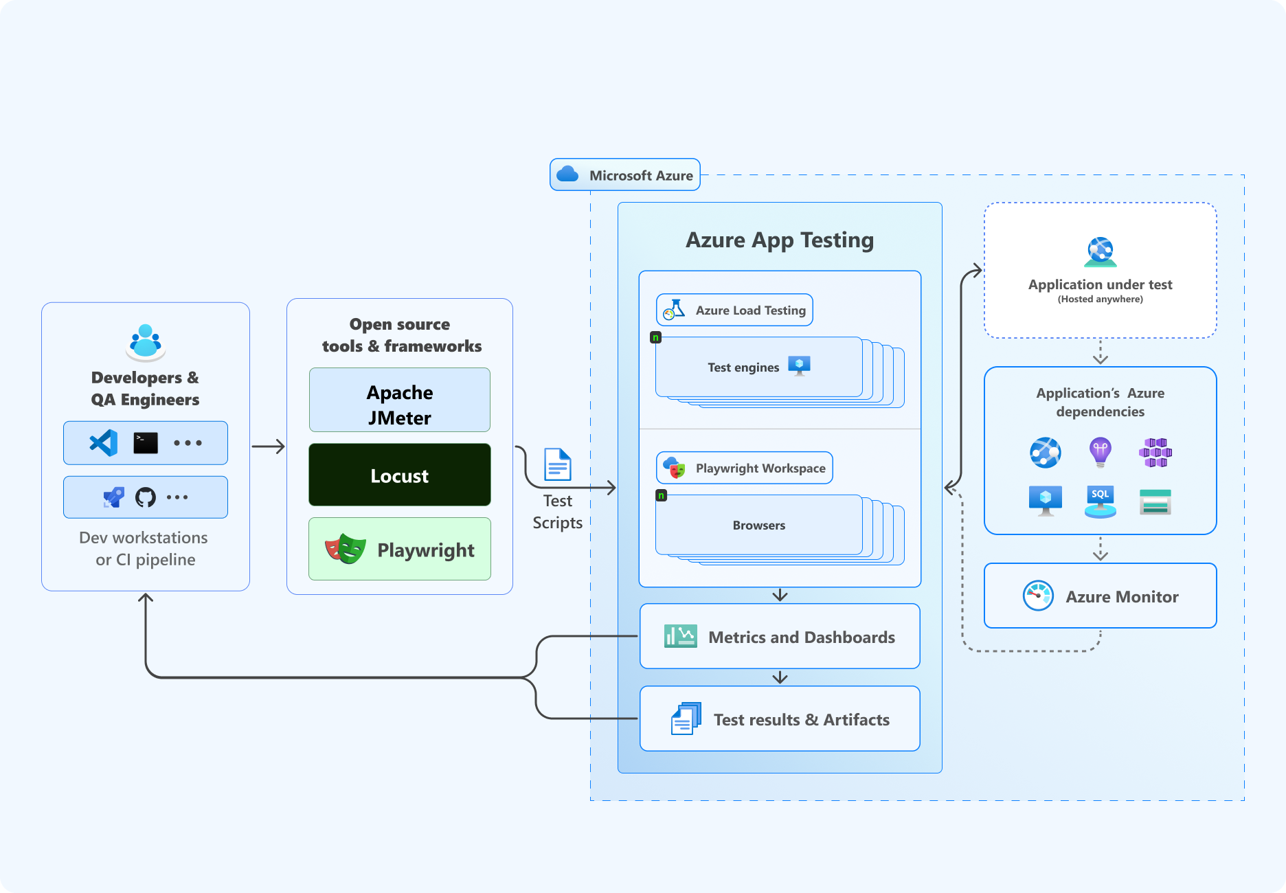 The following diagram shows an overview of how Azure App Testing integrates these capabilities: