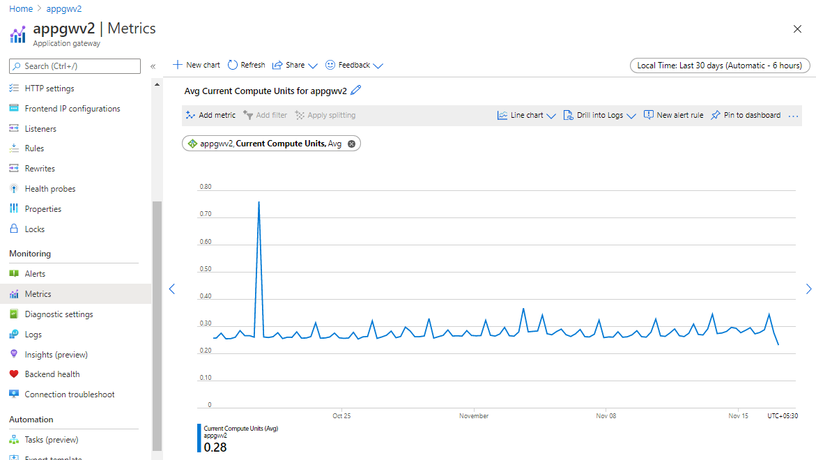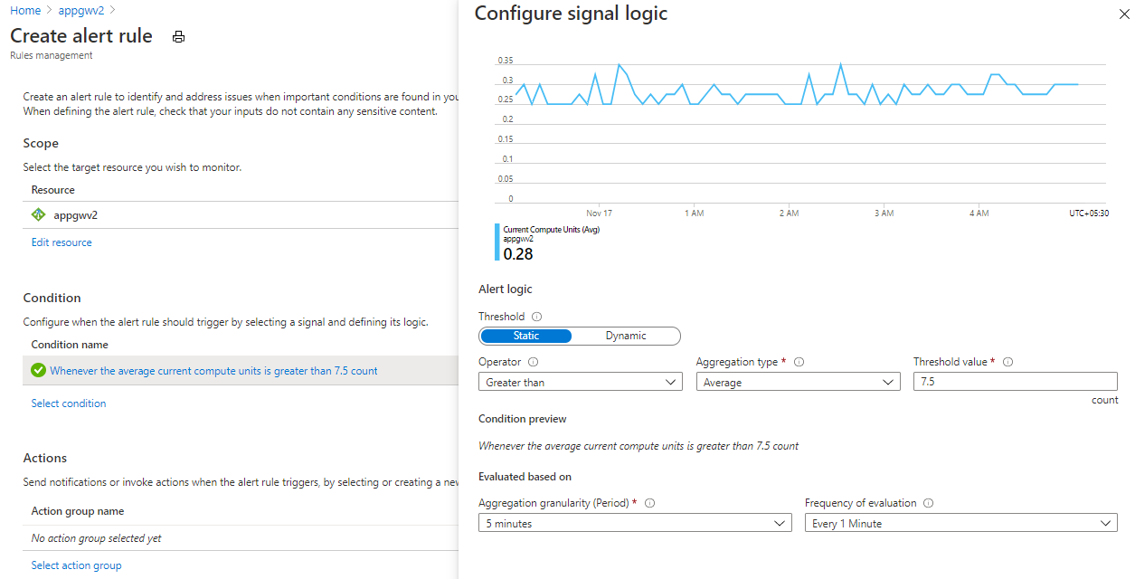 Compute unit's the measure of compute utilization of your Application Gateway. Check your average compute unit usage in the last one month and set alert if it crosses 75% of it. For example, if your average usage is 10 compute units, set an alert on 7.5 CUs. This alerts you if usage is increasing and gives you time to respond. You can raise the minimum if you think this traffic will be sustained to alert you that traffic may be increasing. Follow the scaling suggestions above to scale out as necessary.