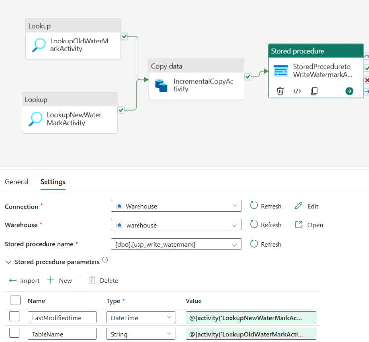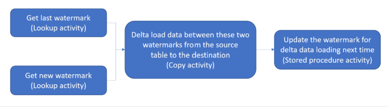 Two lookup activities. The first activity gets the last watermark value (where we stopped last time). The second activity gets the new watermark value (where we stop this time). Both values are passed to the copy activity.