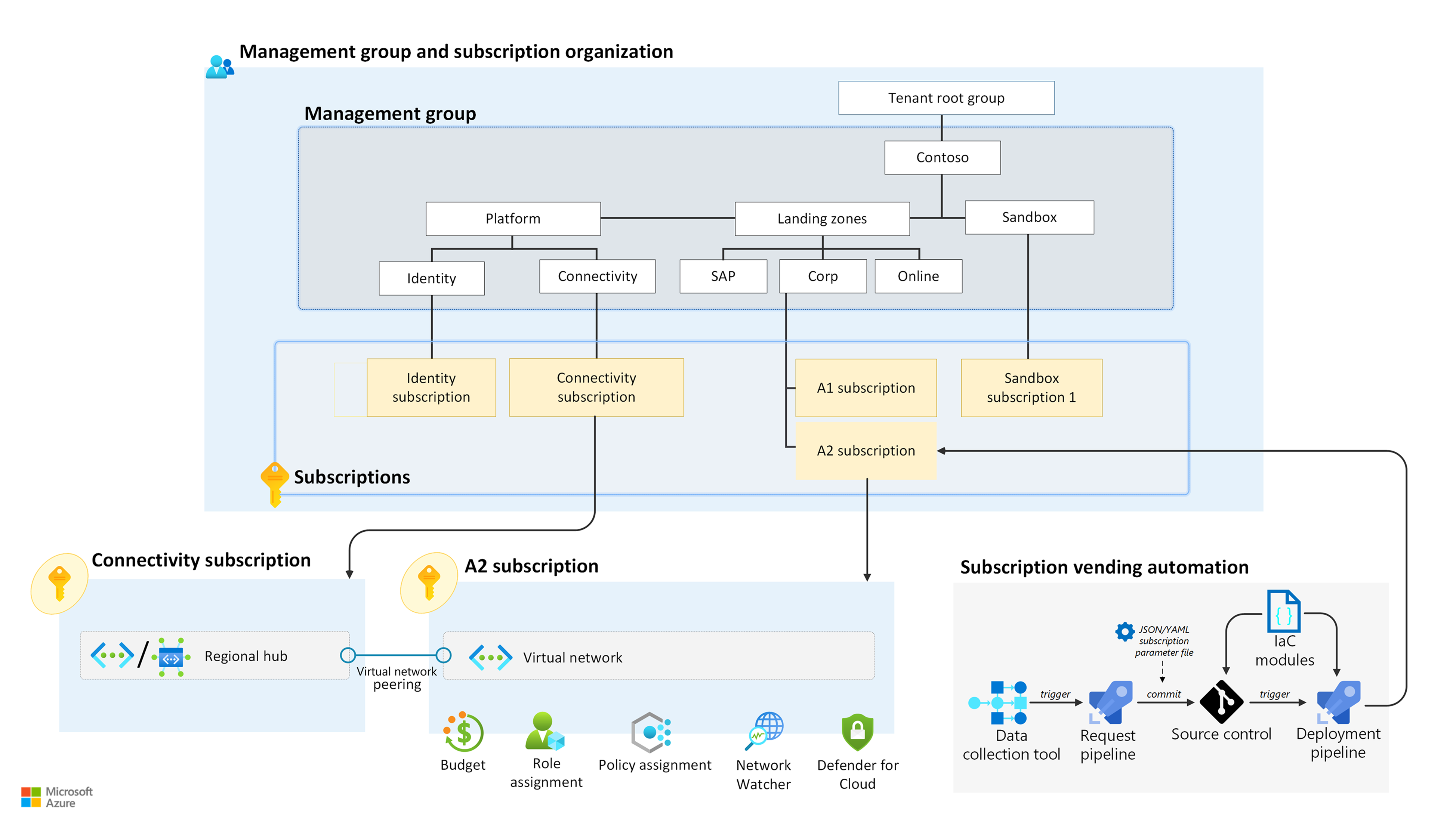 | Governance | • Place in management group hierarchy. • Assign subscription owner. • Set up subscription-level Azure role-based access control (Azure RBAC) to the correct security groups. • Assign subscription-level Azure policies. • Set up the Microsoft Defender for Cloud enrollment. |
