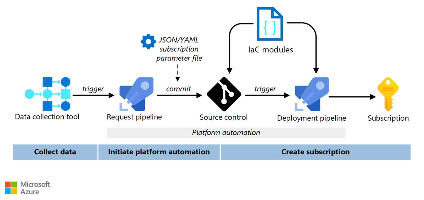 The notification and data from the data collection tool triggers the platform automation. The platform automation creates a subscription parameter file, merges the file to the main branch, and uses the IaC modules to deploy the file to create the subscription. The platform team owns and maintains the platform automation. The platform automation in the preceding example implementation consists of the request pipeline, source control, and the deployment pipeline.